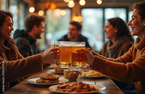 Friends gather in cozy restaurant. People cheers beer mugs. Autumn festivities. Enjoying food, drinks, sharing laughter and moments of togetherness. Casual, warm, friendly atmosphere after work.
