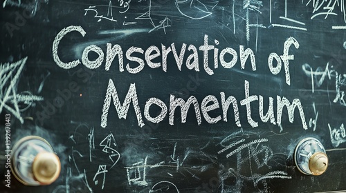 A chalkboard filled with equations and the phrase 'Conservation of Momentum' prominently displayed.