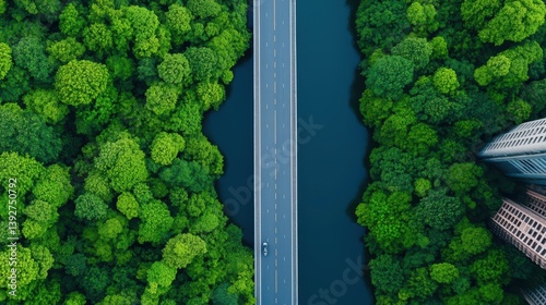 Drone capture of a futuristic escooter bridge over a city river, integrating smart infrastructure with green mobility
