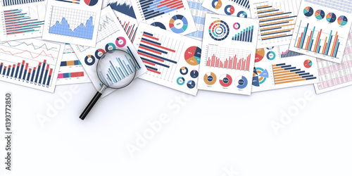 ビジネス資料と虫メガネ、ビジネス業績の検証やデータ分析のイメージ