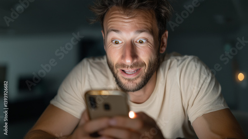 Astonished by the Screen: Captivating close-up of a man's face, reflecting astonishment and surprise as he gazes at his smartphone, the soft glow illuminating his features.
