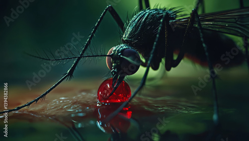 close up of mosquito resting on surface, its proboscis drawing droplet of red liquid. detailed view highlights insect intricate features and textures