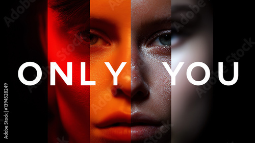 "ONLY YOU" Schriftzug auf farbig beleuchteten Gesichtern vor schwarzem Hintergrund