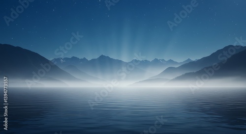 Serene Nightscape: Misty Mountains and Tranquil Lake Under Starry Sky