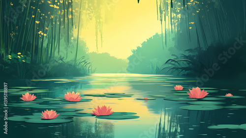 A tranquil, sunlit pond, with water lilies floating on the surface, and the croak of frogs echoing in the distance. Echoing Lagoon. Illustration