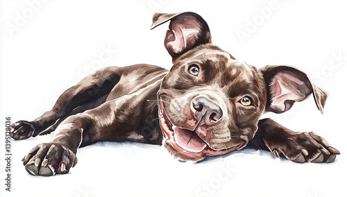 Happy dark brown pitbull in watercolor