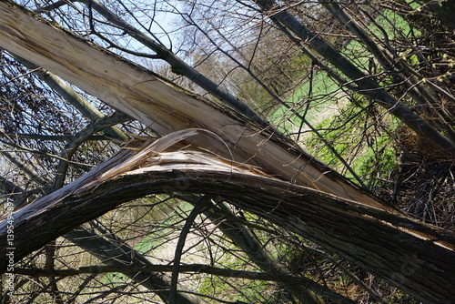 Złamany pień drzewa leży na ziemi, jego postrzępione drewno przypomina o sile natury. Otaczający krajobraz ukazuje skutki burzy.