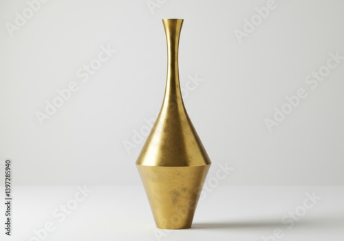 Elegant gold metallic vase with long neck on plain background in simple and minimalist style design