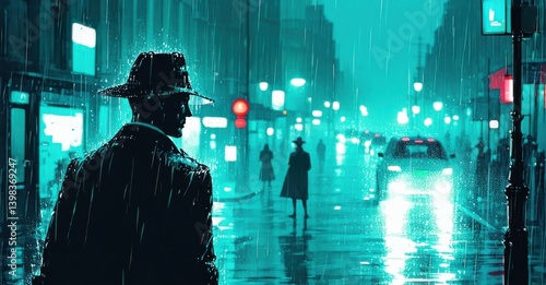 Clean white and teal detective noir visual novel game app icon with silhouette in rainy city realistic detailed glossy style round square shape modern app icon bold vibrant c