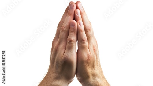 Close-up of two hands pressed together in prayer, isolated on a white background. A symbol of faith, hope, and supplication.