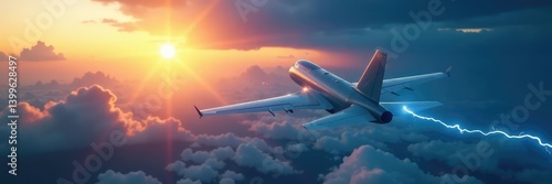 Sunlit aircraft gliding through the blue skies, lightning, glide