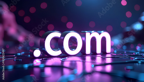Domena internetowa .com, 3D, na futurystycznym, fioletowo-niebieskim tle.