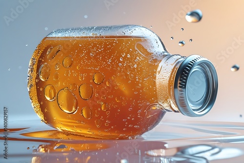 Cold bottle, amber liquid, carbonated drink, condensation droplets, glass container, metal cap, fizzy beverage, light background, product photography, soft shadows, vibrant colors, high contrast, cris