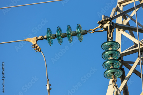 High voltage power line tower with ceramic insulators against clear blue sky. Industrial electricity transmission structure. , Mediterranean, Turkey