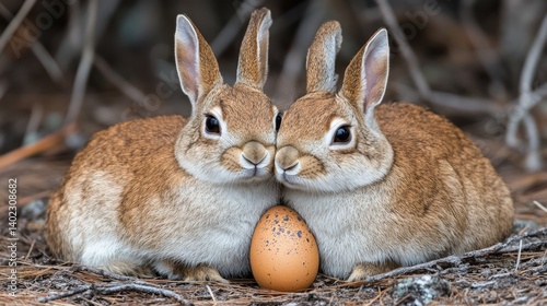 Two rabbits nestled together near an egg in a natural setting.