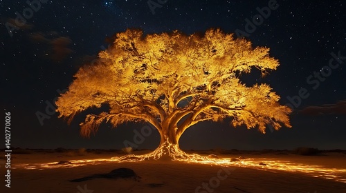 A massive solitary tree its golden leaves shimmering as glowing roots spread beneath the sand under a vast night sky