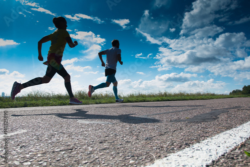 morning jog. the girl runs on the road.sport exchanges run on the road.the man runs on the road