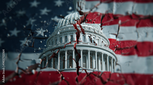 United States Capitol breaking through a cracked american flag, concept of american politics crisis, government shutdown and bipartisan conflict