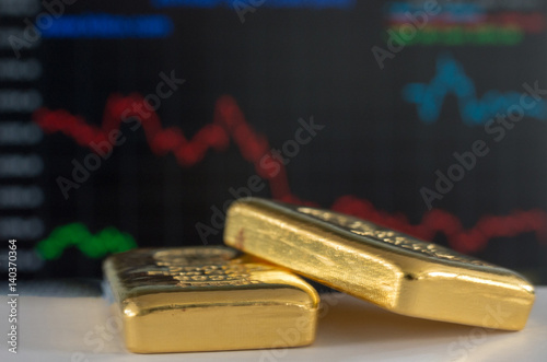 Gold bars on the background of the growth chart. Selective focus. (shallow DOF)