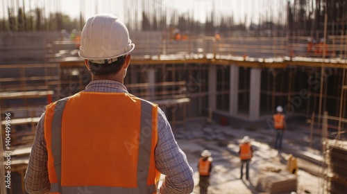 Construction foreman supervising workers at a construction site. Featuring leadership and site management