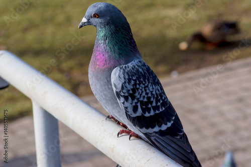 Gołąb (Columba livia) z pomarańczowymi oczami i kolorowymi piórami siedzi na stalowej poręczy. Jego upierzenie charakteryzuje się żywymi, opalizującymi kolorami, szczególnie zielonymi i fioletowymi .