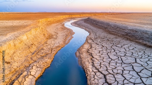 Dried river winding through cracked canyon, freshwater depletion, water scarcity concept