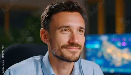 Thoughtful man with headset, looking away from computer screen at night . Generative AI