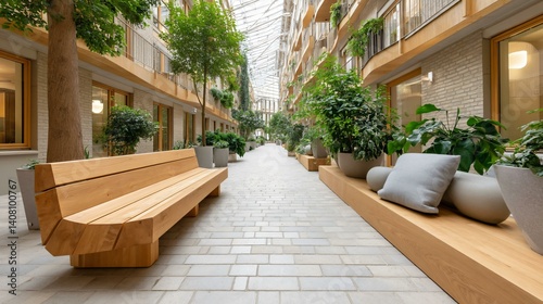 A green-certified office building using passive cooling, thermal insulation, and low-impact concrete, located in an urban garden setting