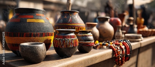 Traditional African pottery vases, beaded jewelry on wooden table outdoors, natural light highlighting vibrant patterns and earthy tones.