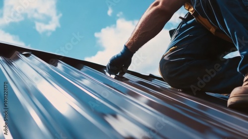Roofing worker installing metal roofing sheets. Featuring roof installation and weatherproofing