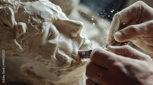 Sculptor chiseling fine details into a marble statue with focused precision. Featuring artistry and patience