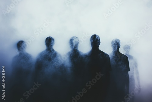 A group of people standing in front of a white background, with blurry, faceless silhouettes The image has a dark and moody atmosphere, with a close-up, cinematic, and hazy appearance Generative AI