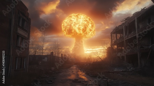 A post-apocalyptic cityscape ravaged by a nuclear explosion.
