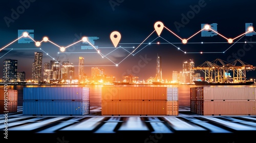 City skyline with container port foreground, digital trade war symbols and economic forecast bars floating above
