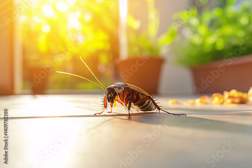 Close up of American Cockroach on Patio in Sunny Sunlight