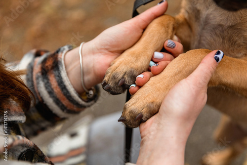 Close-up of Person's Hands Gently Holding Belgian Malinois Puppy Paws