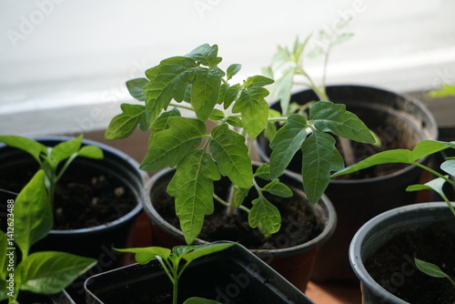 Sadzonki pomidorów rosną w plastikowych doniczkach, z każdym dniem stają się silniejsze. Niedługo będą gotowe do przesadzenia do ogrodu.
