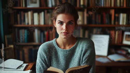 A serene portrait of a young European female writer engrossed in a book, showcasing her deep thought and creativity in a cozy library setting.