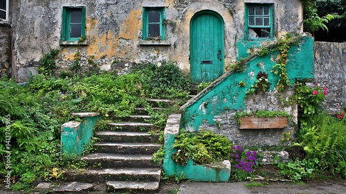 Overgrown stone steps leading to an old, weathered house with a teal door and windows.