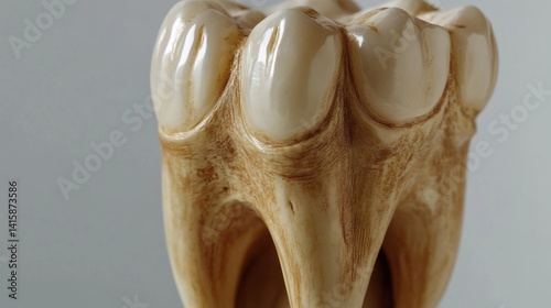 A close-up of a canine tooth model showcasing its pointed structure and smooth enamel surface