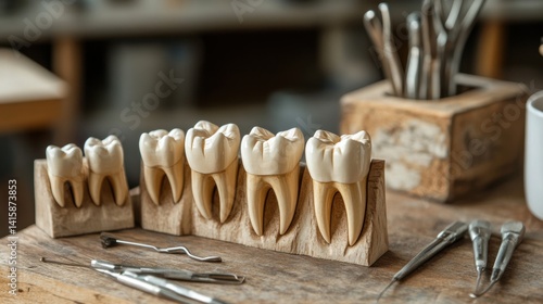 A collection of realistic tooth models arranged neatly on a wooden desk with dental tools nearby
