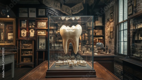 A tooth model displayed in a dental museum exhibit, surrounded by historical artifacts