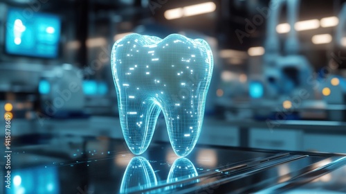 A tooth model displayed in a futuristic dental lab with glowing holographic interfaces