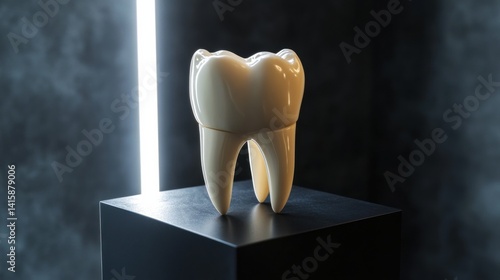 A tooth model displayed on a sleek black pedestal under bright studio lighting