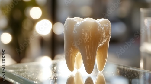 A tooth model displayed on a glass surface with soft reflections and diffused lighting