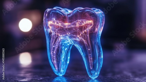 A transparent tooth model glowing under UV light, highlighting its intricate internal structure