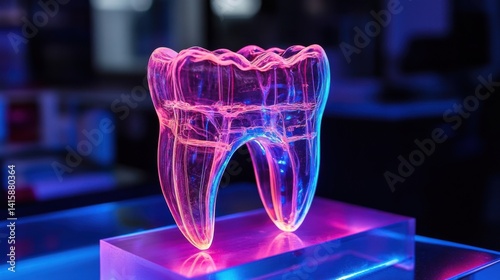 A transparent tooth model glowing under UV light, highlighting its intricate internal structure