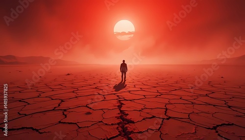 A solitary person stands on a cracked, dried-out plain bathed in a fiery red sunset.