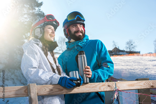 Snowboarders drinking tea