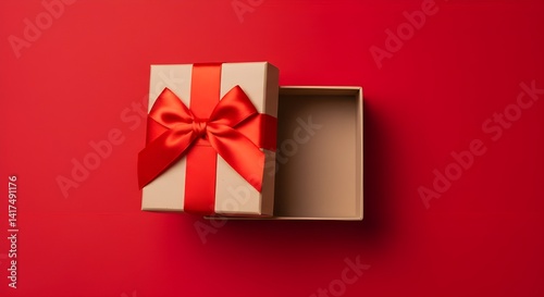 Caja de regalo blanca en blanco abierta o vista superior de caja de regalo blanca atada con un lazo de cinta roja aislada sobre fondo rojo oscuro con sombra, representación conceptual mínima en 3D